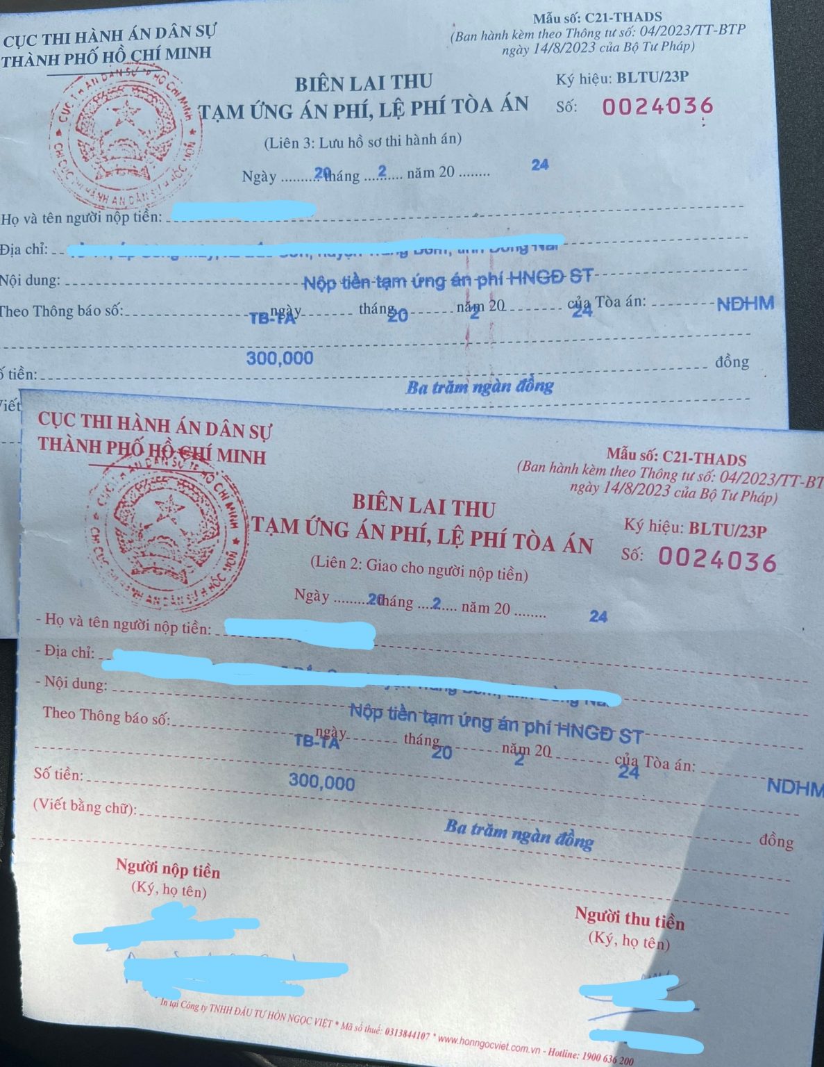 Sau đóng tiền tạm ứng án phí xong thì sẽ nhận được 02 biên lai từ Chi cục Thi hành án huyện Hóc Môn, Thành phố Hồ Chí Minh. Người khởi kiện/người yêu cầu nộp lại cho Toà án nhân dân huyện Hóc Môn, Thành phố Hồ Chí Minh biên lai có màu xanh và giữ lại biên lai màu đỏ.